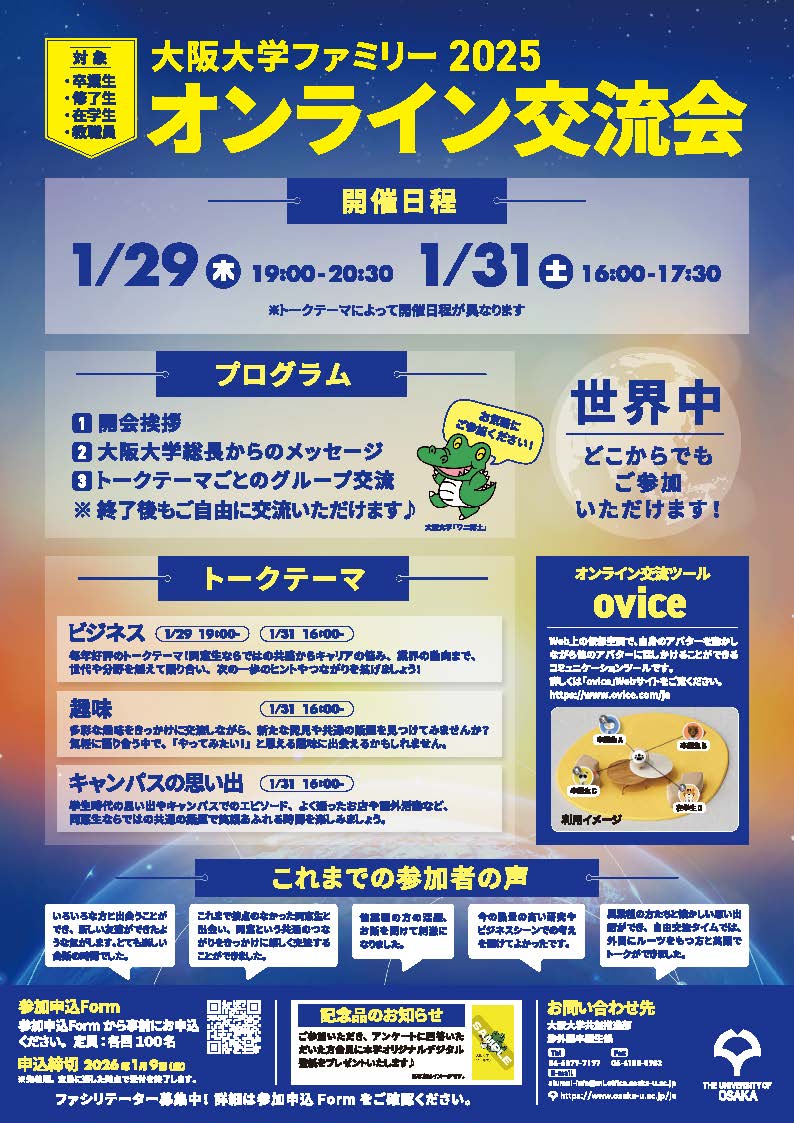 大阪大学同窓会連合会より「大阪大学ファミリー2025オンライン交流会」の案内を